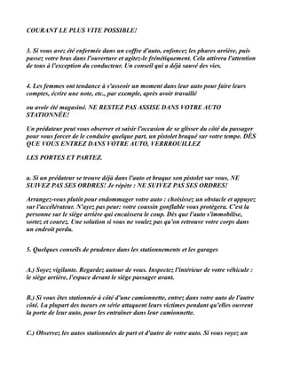 Le document fournit neuf conseils essentiels de sécurité pour éviter les situations dangereuses, en insistant sur l'importance de la prudence et de la vigilance. Il met en avant des recommandations concrètes, comme ne pas rester dans une voiture stationnée trop longtemps et être méfiante des situations apparemment innocentes. Le message encourage à partager ces conseils pour protéger les autres, tout en reconnus que certains pourraient être sensibles à ce type de contenu.
