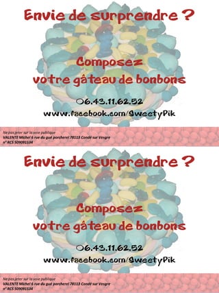 Le document promeut la composition de gâteaux de bonbons et fournit des informations de contact pour Sweetypik. Il inclut un numéro de téléphone, un lien vers une page Facebook et l'adresse de l'entreprise. Des instructions sur la gestion des déchets sont également mentionnées.