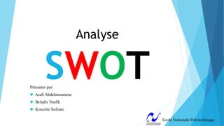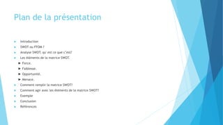 La présentation aborde l'analyse SWOT (forces, faiblesses, opportunités, menaces) comme un outil stratégique pour évaluer la position d'une entreprise sur le marché. Elle détaille la façon de remplir la matrice SWOT en posant des questions clés et fournit des exemples pratiques pour illustrer son utilisation. En conclusion, une analyse SWOT aide à identifier des stratégies basées sur une reconnaissance réaliste des faiblesses et des menaces, tout en exploitant les forces et les opportunités.