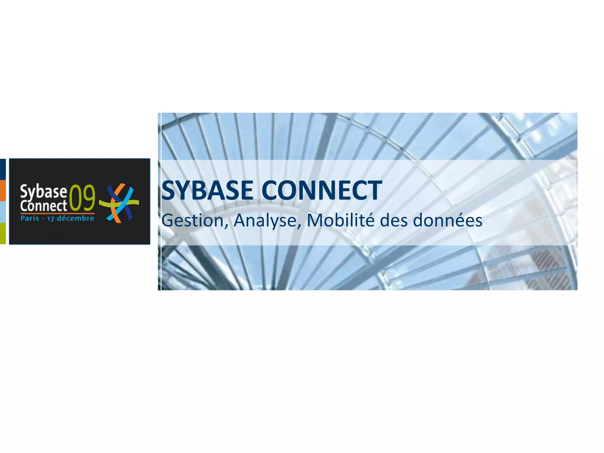Le document traite des ateliers Sybase Connect, axés sur la modernisation et la pérennisation des applications existantes, en particulier via PowerBuilder 12, qui intègre un nouvel IDE et des améliorations locales. Il souligne la stratégie orientée vers .NET et les efforts pour faciliter la migration vers de nouvelles plateformes avec un accent sur les capacités de PowerBuilder à développer des applications compatibles avec des technologies futures. En outre, il présente les évolutions prévues concernant les fonctionnalités, l'interface utilisateur et la prise en charge des formats de données dans le cadre de la transition vers WPF et Silverlight.