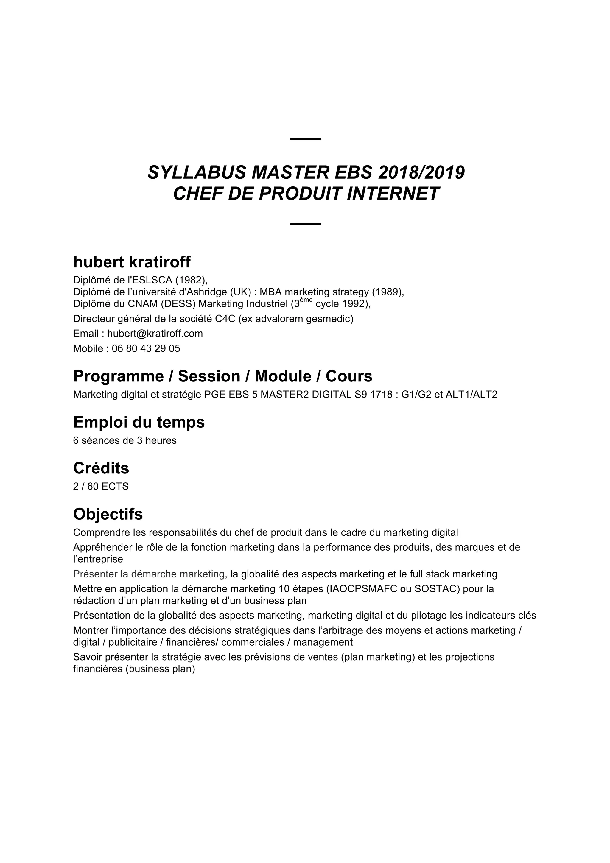 Le syllabus du Master EBS 2018/2019 est centré sur le marketing digital et la fonction de chef de produit. Il couvre divers aspects tels que la stratégie marketing, le contenu, le growth hacking, et les méthodes agiles, avec une approche pratique à travers des quizz et des études de cas. Les étudiants apprendront à élaborer des plans marketing et business plans tout en développant des compétences en analyse et utilisation des outils digitaux.