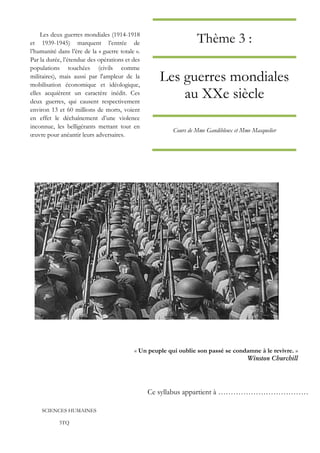 Le document traite des guerres mondiales du XXe siècle, soulignant leur caractère de 'guerre totale' à travers la mobilisation économique, idéologique et humaine, causant des pertes humaines massives. Il explore le déclenchement de la Première Guerre mondiale, son évolution, ses conséquences et le contexte mondial, ainsi que les répercussions profondes de la Seconde Guerre mondiale. Le syllabus met également en lumière le changement de la carte de l'Europe et les impacts sur les sociétés civiles.