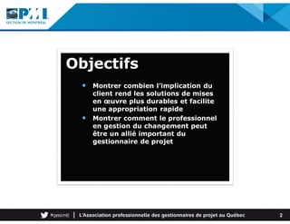 Le document présente l'importance de l'implication du client dans la gestion de projet pour assurer des solutions durables et un changement efficace. Il souligne le rôle du gestionnaire de projet et du professionnel en gestion du changement comme alliés clés dans la mobilisation et la participation des parties prenantes. Des exemples concrets illustrent les bénéfices d'une telle approche, tant pour le client que pour le gestionnaire de projet.