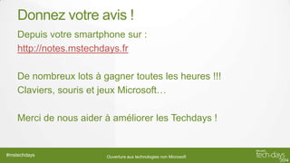 Le document présente des informations sur les TechDays, mettant en avant la participation de Brainsonic, une agence blended, qui propose des solutions cloud, notamment via Azure, pour améliorer l'engagement des utilisateurs avec des expériences connectées. Il décrit également les différentes offres d'hébergement et de gestion des médias, incluant des solutions pour les applications web et les vidéos interactives. En conclusion, il mentionne le succès d'un projet de gestion de contenu utilisé par France24 et d'autres clients.