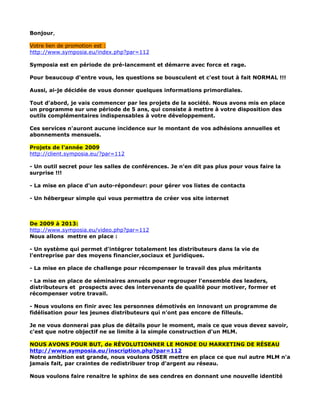 Symposia entame sa période de pré-lancement avec un programme quinquennal offrant des outils pour le développement sans impact sur les adhésions. Des projets incluent un auto-répondeur, un outil pour conférences, et des séminaires annuels pour leaders et distributeurs. L'objectif est de révolutionner le marketing de réseau avec des innovations et un système de fidélisation pour les jeunes distributeurs.