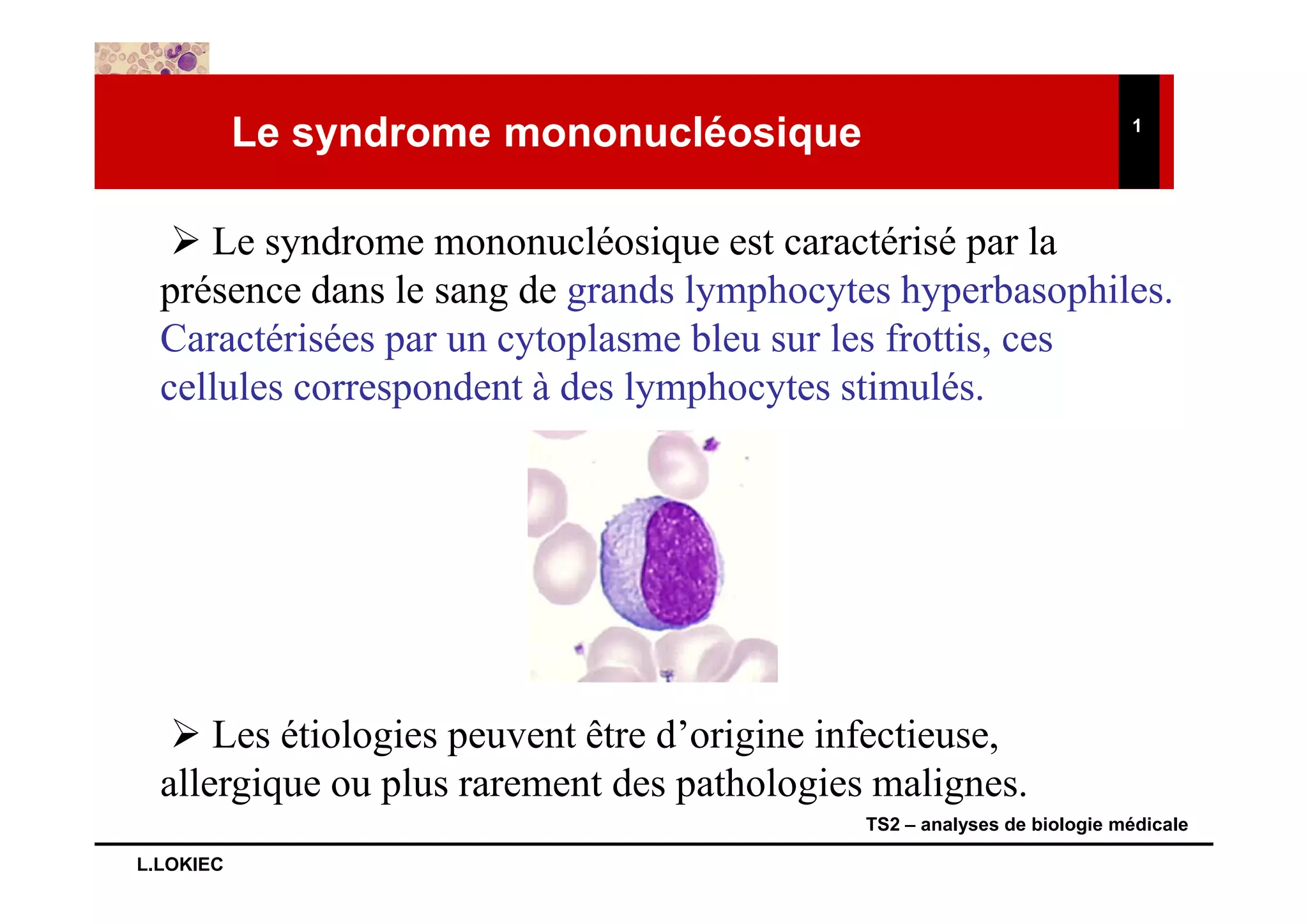Le syndrome mononucléosique est défini par la présence de grands lymphocytes hyperbasophiles dans le sang, souvent en raison d'infections, d'allergies ou de pathologies malignes. Il se manifeste sous trois formes morphologiques en fonction du type de lymphocytes activés présents. Les analyses de biologie médicale permettent de mieux caractériser ces lymphocytes activés en fonction de leur aspect cytoplasmique.