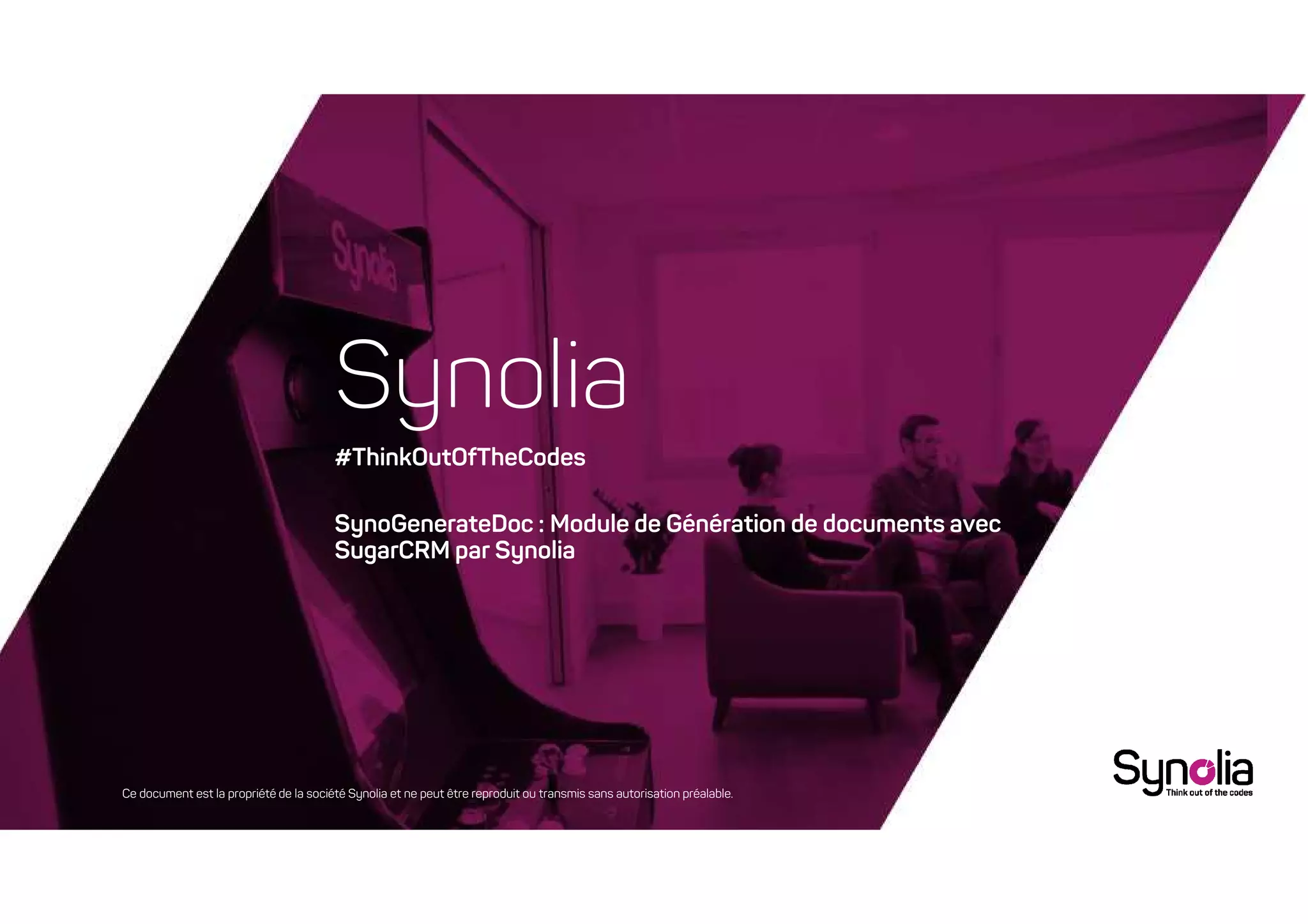 Le document présente le module 'synogeneratedoc' développé par Synolia, permettant la génération de documents MS Office et Open Office directement dans SugarCRM. Les utilisateurs peuvent créer des modèles de documents qui fusionnent les données de SugarCRM avec une interface simple. Ce module est compatible avec les éditions Professional, Enterprise et Ultimate de SugarCRM, et son installation respecte les procédures de mise à jour du framework.