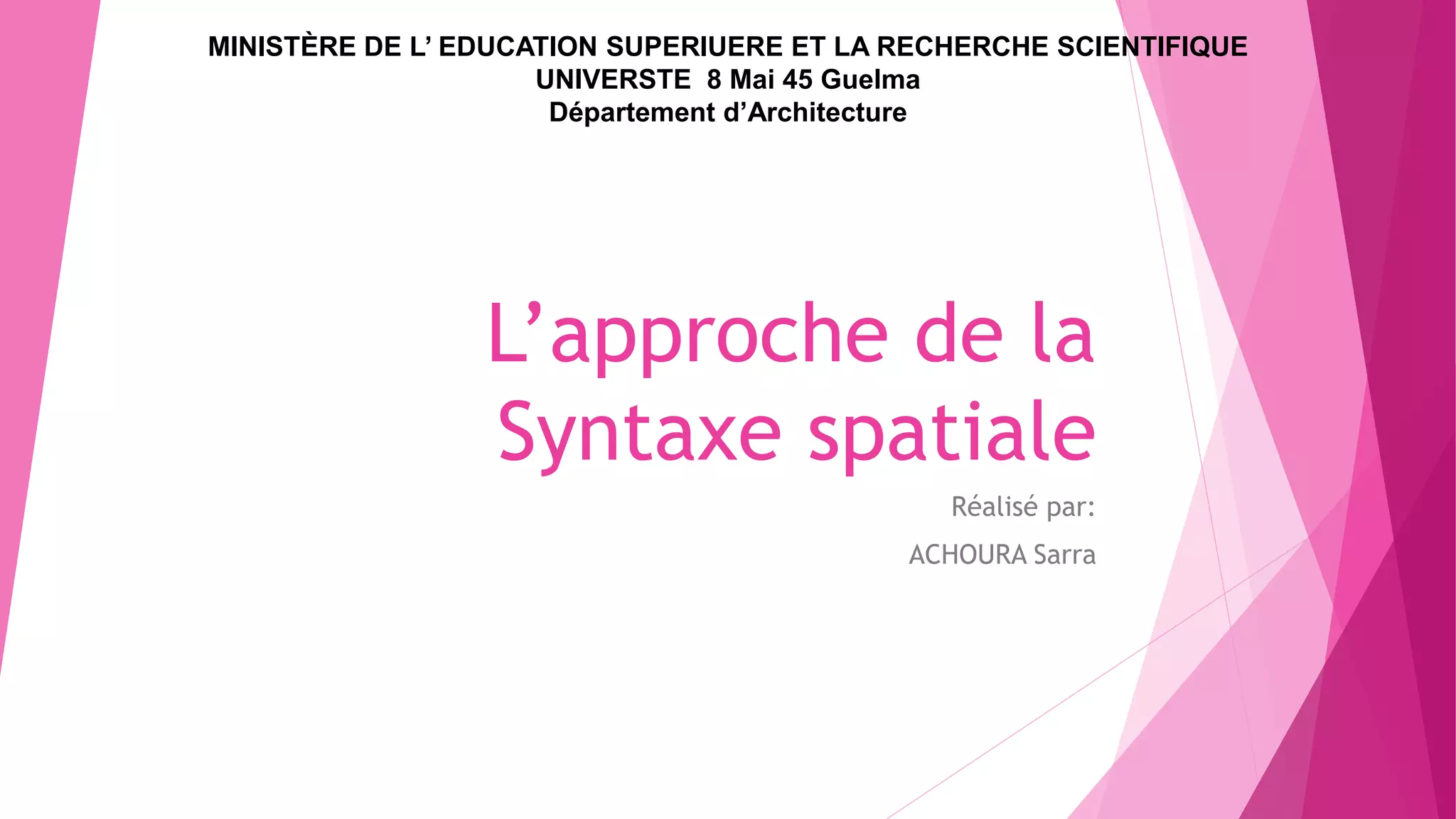 Le document explore la syntaxe spatiale, qui est une approche analytique des configurations spatiales influençant les comportements humains. Il aborde également la préservation du patrimoine, en définissant différents types de patrimoine et en soulignant l'importance de techniques comme la rénovation et la réhabilitation. Enfin, il discute de l'application de la syntaxe spatiale dans la conservation des sites classés au patrimoine mondial de l'UNESCO, notamment en Algérie.