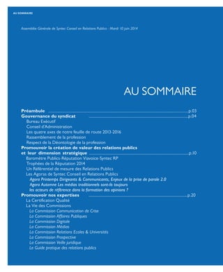 Le rapport d'activités 2013-2014 de Syntec Conseil en Relations Publics présente les actions entreprises pour accompagner ses adhérents, illustrant notamment une gouvernance structurée et une feuille de route axée sur la création de valeur des relations publics. Il détaille également des initiatives telles que des baromètres de réputation, des trophées de la réputation, et des agoras visant à promouvoir le professionnalisme et la déontologie dans le secteur. Enfin, le syndicat s'engage à élargir son influence en augmentant le nombre d'agences adhérentes et en soutenant la mise à jour des pratiques déontologiques.