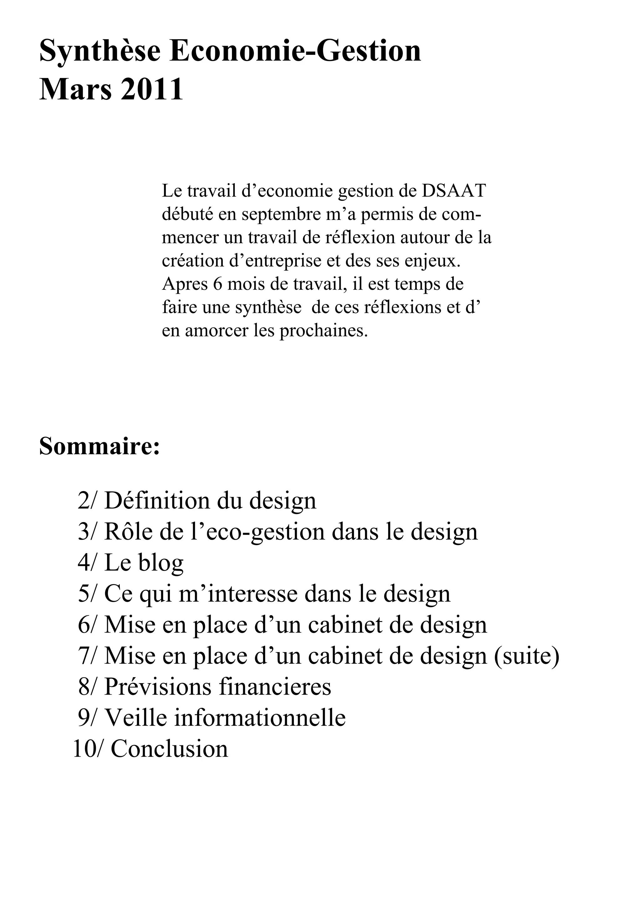 Le document présente une synthèse des réflexions d'un étudiant en économie-gestion sur la création d'entreprise dans le domaine du design. Il aborde des sujets comme la définition du design, le rôle de l'éco-gestion, la création d'un cabinet de design et l'importance d'une veille informationnelle. Les prévisions financières et les motivations personnelles pour créer cette entreprise, ainsi qu'une vision collaborative, sont également discutées.