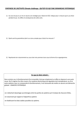 Le document aborde la démarche systémique dans le cadre d'une activité de réduction du CO2. Il souligne l'importance d'une approche globale pour comprendre le fonctionnement des systèmes complexes, en se concentrant sur les interactions plutôt que sur les éléments isolés. La synthèse propose également de représenter le raisonnement par un organigramme pour visualiser les décisions prises lors du jeu.
