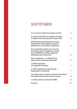 L'accord de développement des emplois et des compétences (ADec) dans le secteur de la construction, mis en œuvre de 2009 à 2012, a soutenu 600 entreprises et formaté 1 251 stagiaires, avec plus de 60 200 heures de formation. Il a facilité un dialogue continu entre partenaires pour adapter les compétences aux besoins du marché et aux défis économiques, tout en mettant en avant des dispositifs comme la démarche défi compétences et la gpec appliquée. L'évaluation réalisée a montré des effets positifs sur l'organisation des entreprises, la professionnalisation des acteurs et une meilleure adaptation des compétences dans un secteur en mutation.