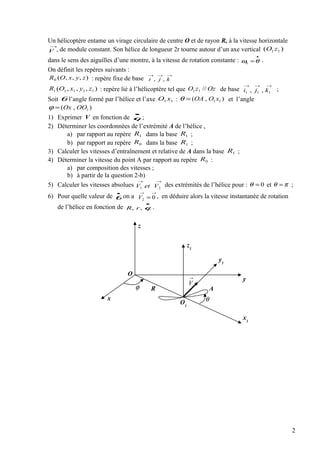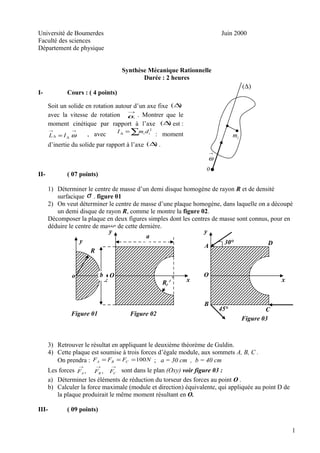 Le document est un examen de mécanique rationnelle abordant le calcul du centre de masse de formes géométriques simples, ainsi que l'analyse des forces agissant sur une plaque. Il inclut des questions sur le moment cinétique d'un solide en rotation et des calculs de vitesse liés à un hélicoptère effectuant un virage. Les exercices sont structurés et portent sur des concepts fondamentaux en physique, avec des figures pour appuyer les questionnements.