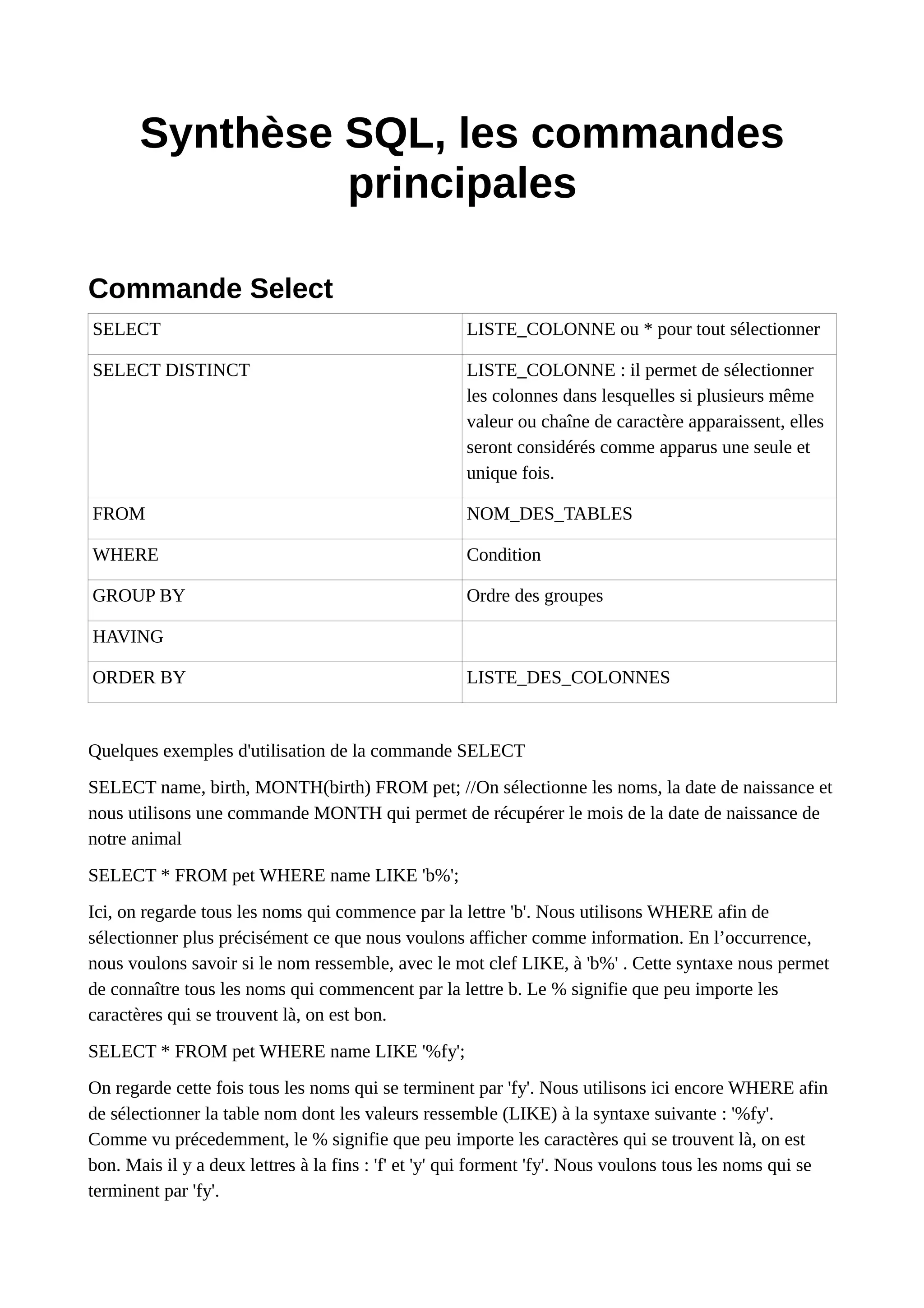Le document présente une synthèse des commandes principales SQL, en mettant l'accent sur la commande SELECT pour extraire des données. Il fournit des exemples d'utilisation des clauses WHERE, LIKE, et des fonctions telles que MIN, MAX et AVG. Les autres commandes SQL comme INSERT, DELETE et UPDATE sont brièvement décrites.