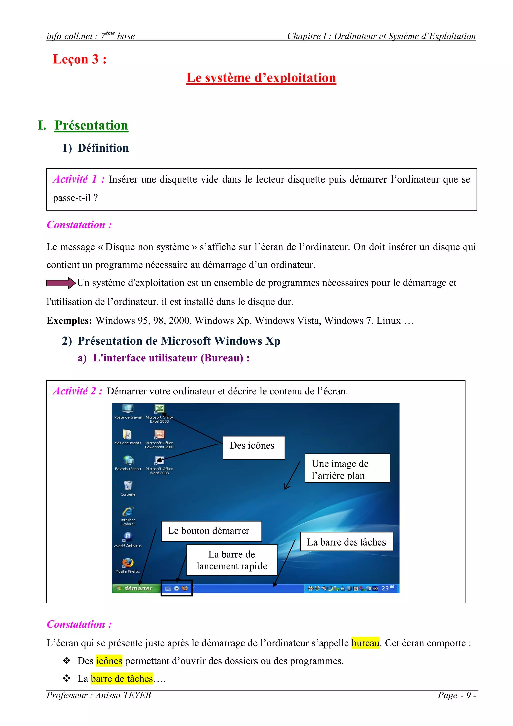 Le document fournit une introduction aux systèmes d'exploitation, définissant leur rôle essentiel dans le démarrage et l'utilisation des ordinateurs, avec un focus sur Windows XP et son interface utilisateur. Il décrit également la gestion des fichiers et des répertoires, ainsi que des manipulations simples comme la création, la suppression, la copie et le renommage de fichiers. Enfin, des raccourcis clavier pour faciliter les tâches sont également présentés.