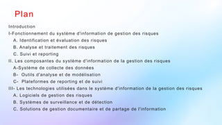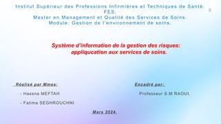 Le document traite du système d'information de gestion des risques (Sigr) dans les services de soins de santé, soulignant son rôle crucial dans l'identification, l'évaluation et le traitement des risques pour garantir la sécurité des patients. Il décrit les éléments clés du Sigr, tels que les systèmes de collecte des données, les outils d'analyse, les plateformes de reporting, et les technologies utilisées, tout en abordant l'importance de la formation et du suivi. Enfin, le document examine les avantages et défis associés à la mise en œuvre du Sigr dans les établissements de santé.