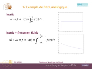 Le document aborde divers concepts fondamentaux du traitement numérique du signal, incluant les filtres analogiques, la convolution, la transformée de Laplace, et les propriétés des systèmes invariants. Il traite également des concepts avancés tels que la réponse impulsionnelle, les filtres linéaires, et la relation entrée-sortie. Enfin, le texte mentionne la stabilité des filtres et les caractéristiques de minimum de phase.