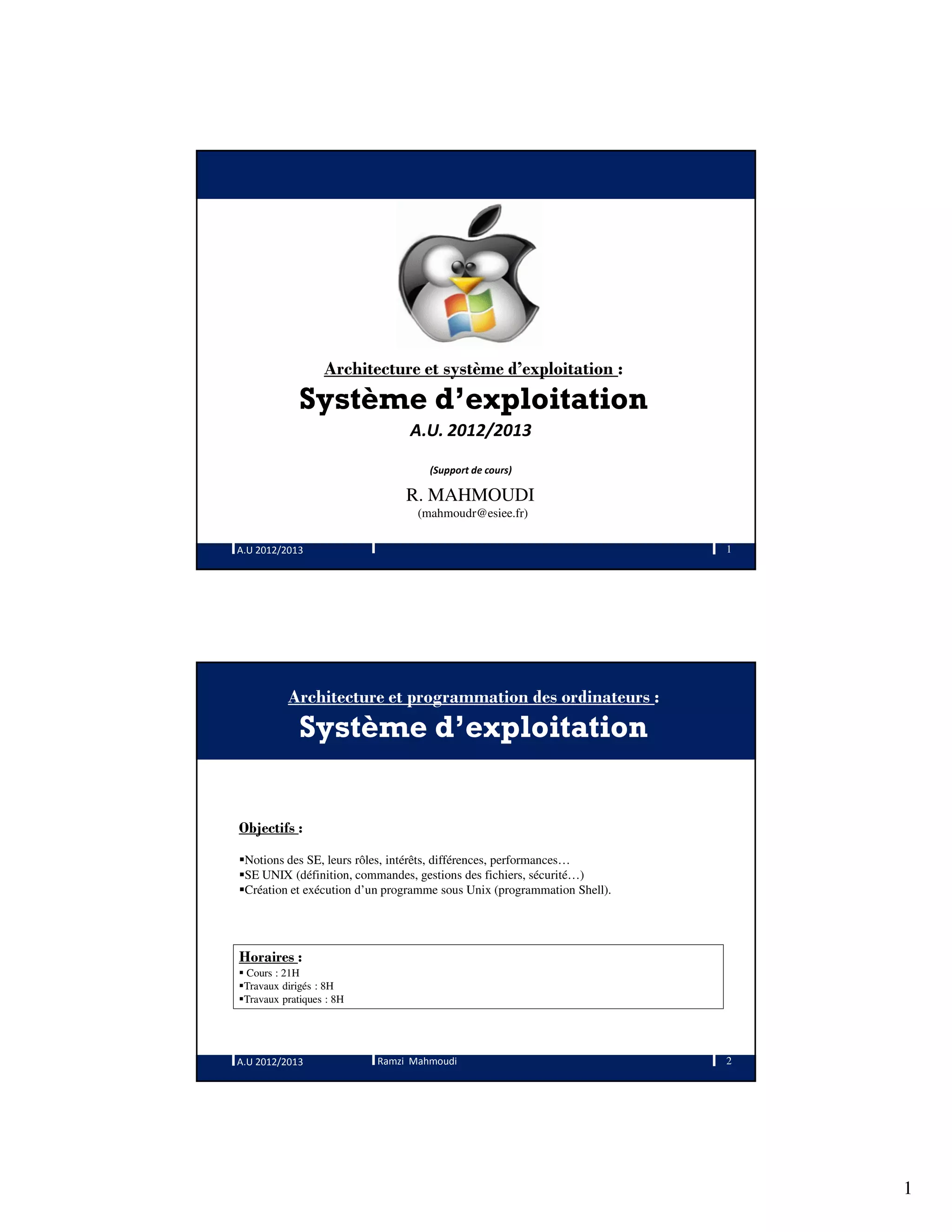 Ce document présente un cours sur les systèmes d'exploitation, couvrant des concepts tels que leur définition, leurs rôles, le système Unix, la programmation shell, ainsi que l'historique et les fonctions des systèmes d'exploitation. Il explore également la gestion des ressources, les processus, les interruptions et les systèmes de fichiers. Le document est destiné aux étudiants et inclut des cours théoriques et des travaux pratiques.