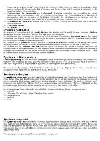 Le document décrit le fonctionnement des systèmes d'exploitation, responsable de la gestion des ressources matérielles, des processus et de l'interface utilisateur. Il aborde différents types de systèmes d'exploitation, tels que multitâches, multiprocesseurs, embarqués et temps réel, ainsi que leurs rôles, composants et avantages. Enfin, il présente aussi des comparatifs de versions et de prix pour éclairer les choix des utilisateurs.