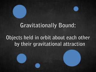 #4 For example, satellites in orbit around the earth are gravitationally bound to Earth since they can't escape Earth's gravity. By contrast, the Voyager spacecraft, which explored the outer solar system, was launched with enough energy to escape Earth's gravity altogether, and hence it is not gravitationally bound. The Moon, is gravitationally bound to the Earth, and the Earth to the Moon. The Earth is gravitationally bound to the Sun, and the Sun to the Earth. In fact, everything in our Solar System is gravitationally bound, which is why we are called a solar SYSTEM, because we are a gravitationally bound system, bound by the incredible mass of the Sun that keeps us all together.