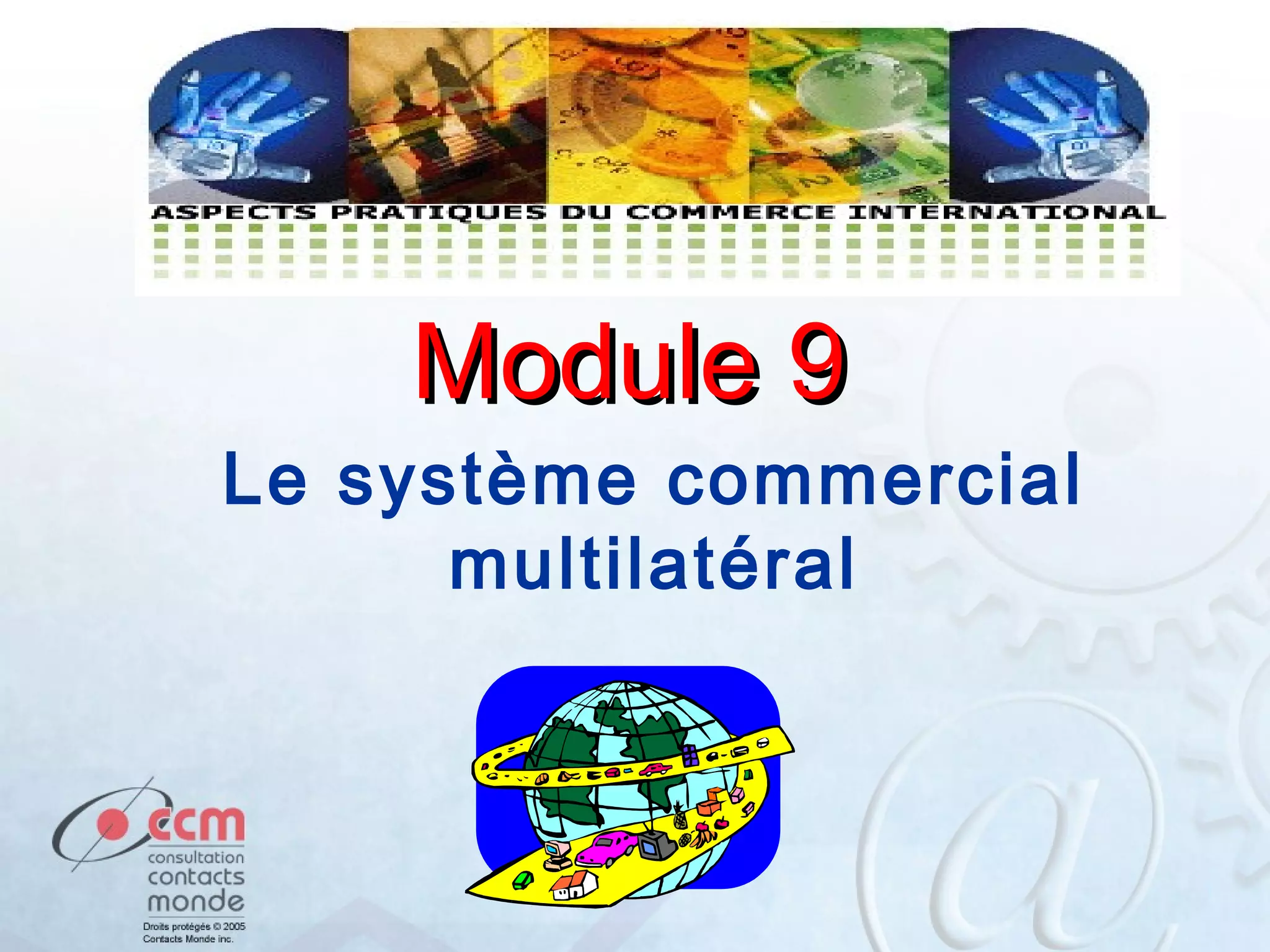 Ce document présente le système commercial multilatéral, en mettant l'accent sur les avantages du commerce ouvert, tels que la réduction des coûts de la vie et des produits. Il fournit un aperçu de l'OMC, des accords qui la régissent et de ses principes fondamentaux, tels que la non-discrimination et la transparence. En outre, il souligne l'importance de la libéralisation pour divers secteurs, y compris l'agriculture, le textile et les services.