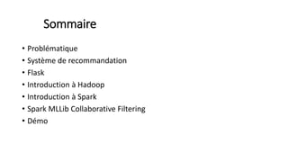 Le document traite de la création d'un système de recommandation de films utilisant des technologies comme Hadoop, Spark et Flask. Il aborde les défis liés au choix des consommateurs et les étapes nécessaires pour établir un modèle de filtrage collaboratif, ainsi que les technologies sous-jacentes et les concepts clés. Une démo est prévue pour illustrer l'application du modèle avec un jeu de données de 21 millions de notes attribuées à des films.