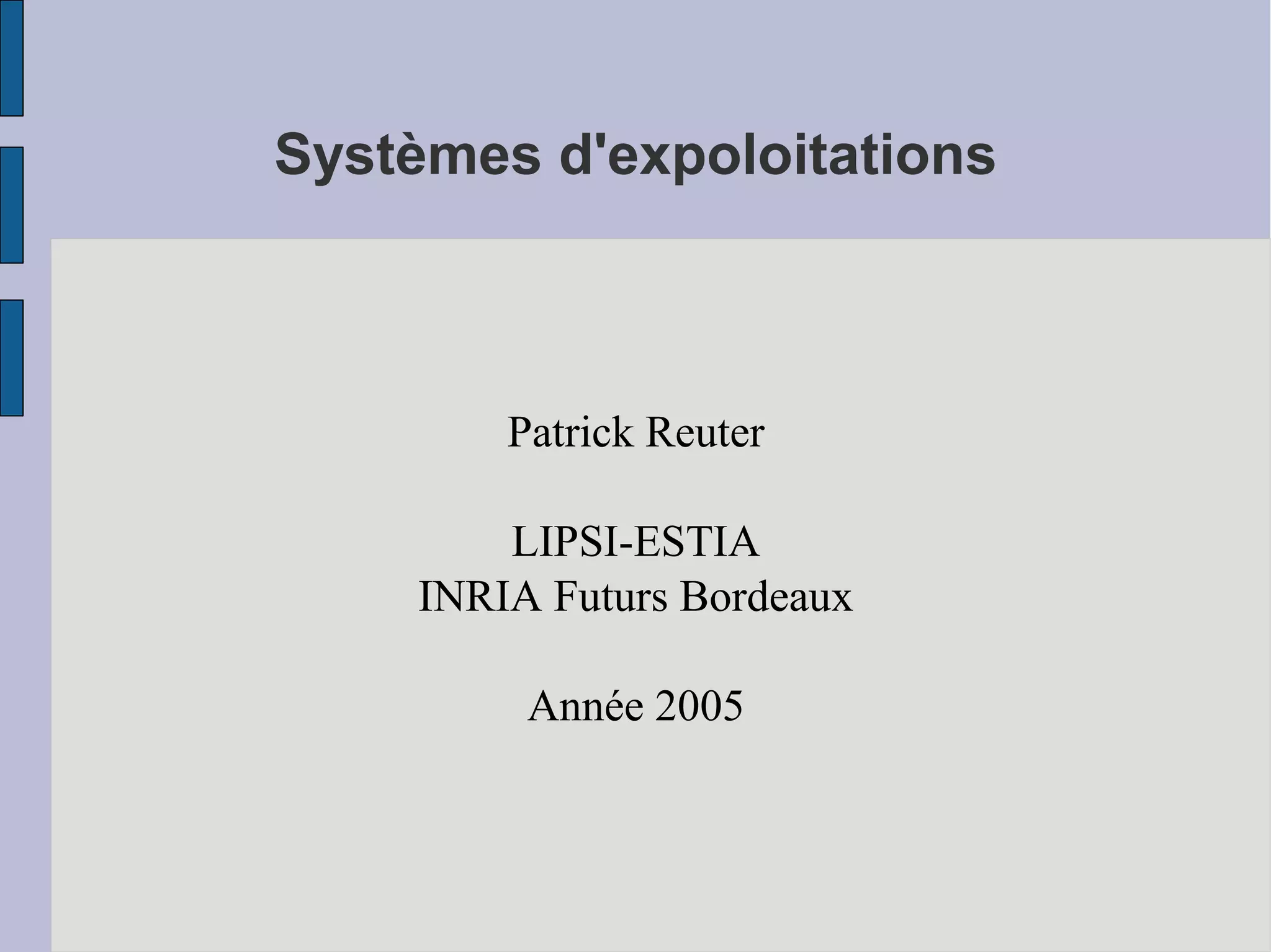 Le document présente une vue d'ensemble des systèmes d'exploitation, expliquent leur rôle dans la gestion des ressources matérielles et l'amélioration de l'expérience utilisateur. Il aborde différentes caractéristiques des systèmes d'exploitation, y compris la gestion de la mémoire, des fichiers, des processus et des périphériques, ainsi que les grandes familles de systèmes d'exploitation au fil de l'histoire. Des concepts tels que le multitâche, le temps partagé et les systèmes distribués sont également discutés pour illustrer les évolutions et les exigences modernes en matière de systèmes d'exploitation.