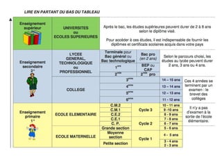 Le système éducatif en France comprend l'éducation obligatoire de 6 à 16 ans, ainsi que divers parcours dans l'enseignement supérieur, tels que les universités et les grandes écoles. En matière de travail, les contrats à durée déterminée (CDD) et indéterminée (CDI) sont les plus courants, et il existe diverses formes de travail, y compris à temps partiel et intérim. La préparation d'un CV et la conduite d'entretiens d'embauche sont des étapes essentielles pour intégrer le marché du travail.