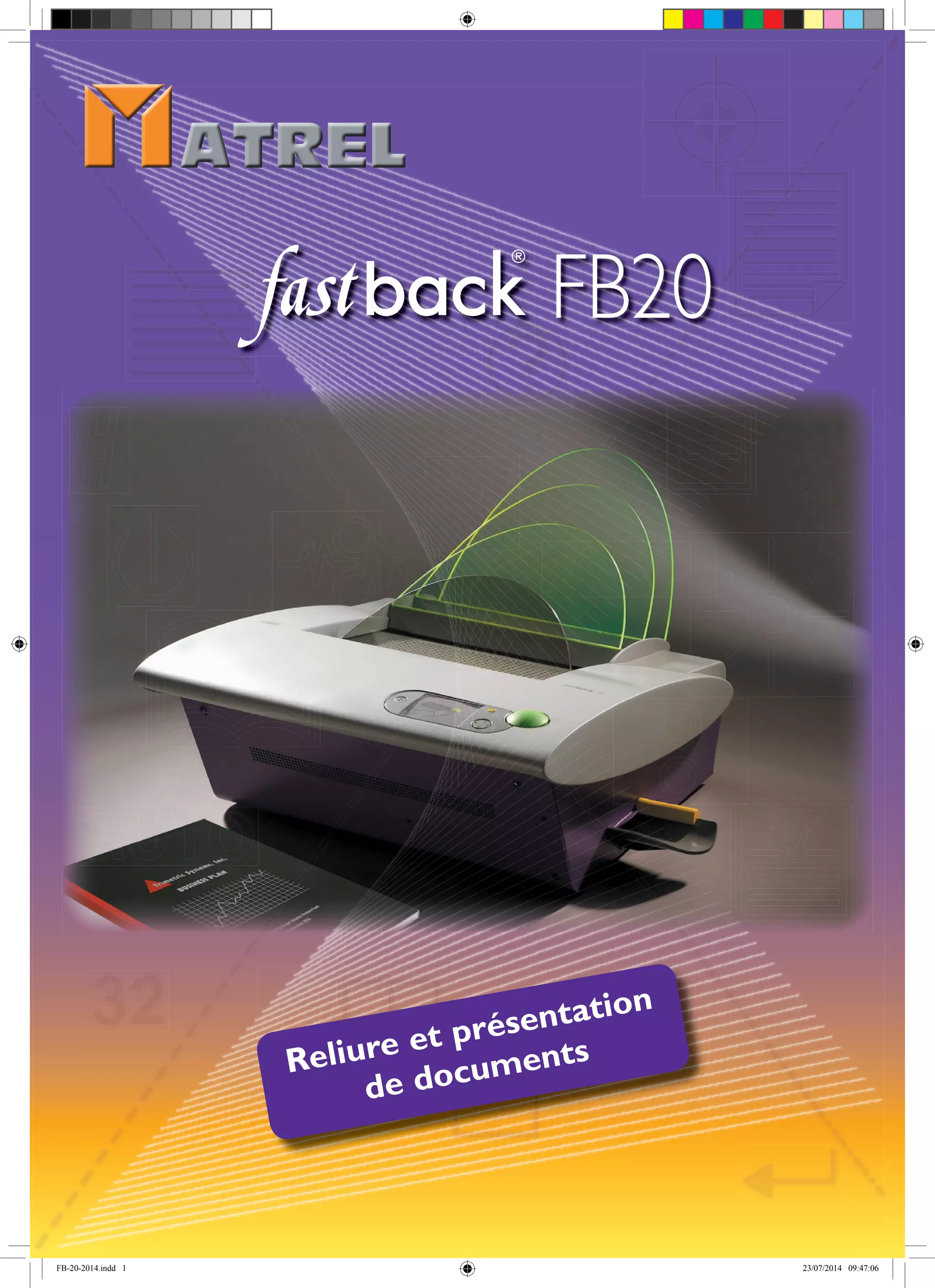 Le document présente le système de reliure FB20, qui permet de relier jusqu'à 350 feuilles avec des bandes thermo-collantes, offrant une solution rapide, simple et écologique grâce à des composants certifiés FSC et recyclables. Il met en avant des caractéristiques telles qu'une consommation d'énergie réduite et des options de personnalisation pour des documents originaux. Le FB20 est conçu pour une utilisation conviviale, avec un cycle de reliure rapide et la possibilité de travailler avec divers types de papiers et de couvertures.