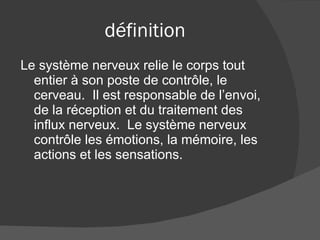 Le système nerveux connecte le corps au cerveau, gérant l'envoi et le traitement des influx nerveux responsables des émotions, de la mémoire et des sensations. Il est constitué du cerveau, de la moelle épinière et des nerfs, les neurones étant essentiels à la transmission des informations. Divers faits intéressants incluent le poids du cerveau et la vitesse de transmission des impulsions.
