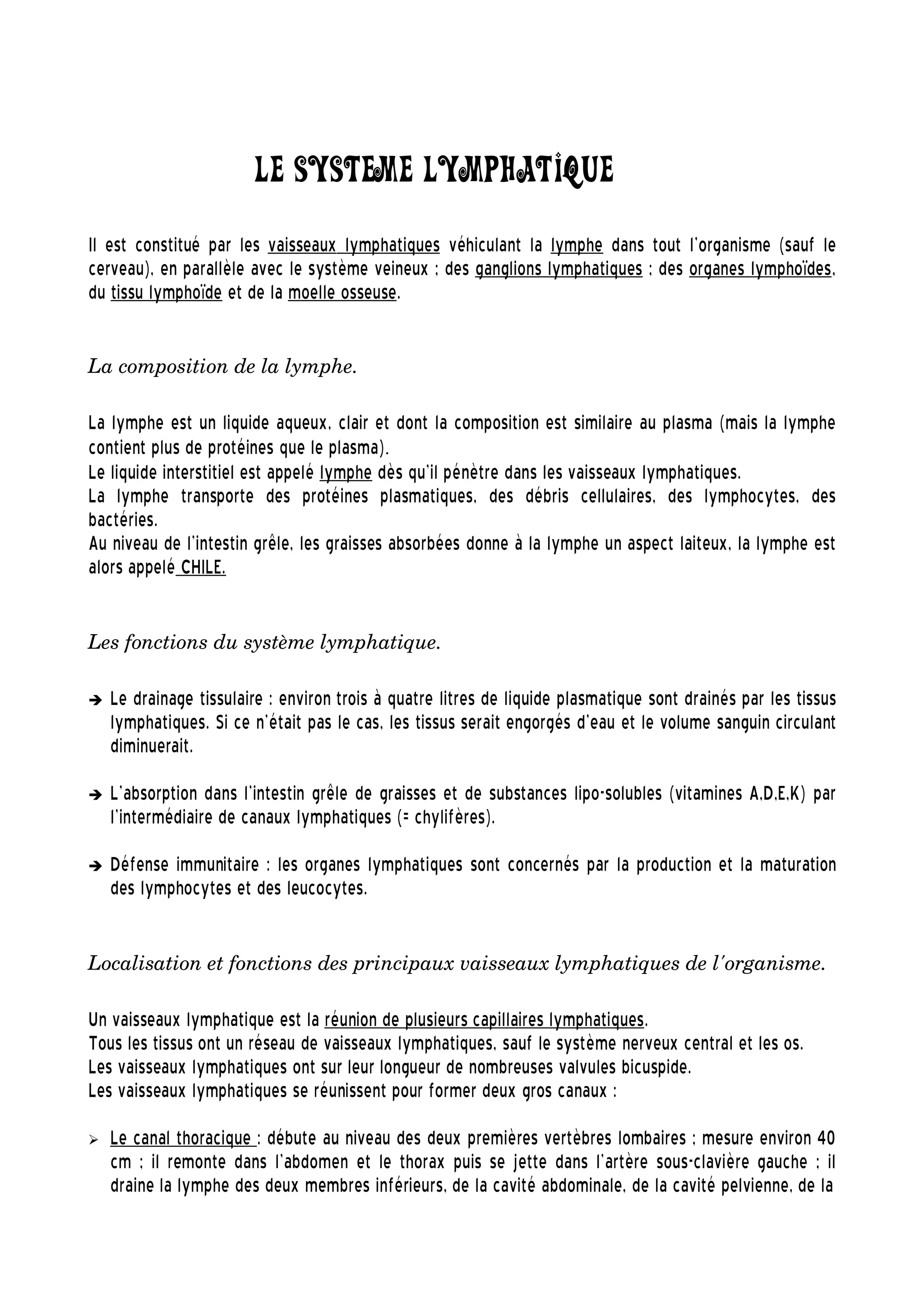 Le système lymphatique, constitué de vaisseaux lymphatiques, ganglions lymphatiques et organes lymphoïdes, joue un rôle crucial dans le drainage tissulaire, l'absorption des graisses et la défense immunitaire. La lymphe, un liquide riche en protéines, transporte des lymphocytes et d'autres substances à travers l'organisme. Les ganglions lymphatiques filtrent la lymphe et prolifèrent des lymphocytes, tandis que des organes comme la rate et le thymus ont des fonctions spécifiques telles que le stockage de sang et la maturation des lymphocytes T.