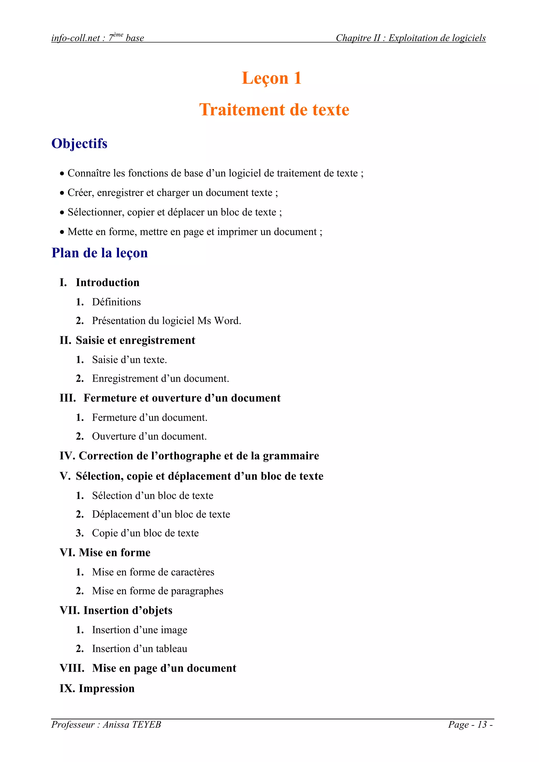 Le document traite des fonctionnalités essentielles d'un logiciel de traitement de texte, notamment la saisie, l'enregistrement, la mise en forme et l'impression de documents. Il fournit des instructions étape par étape sur l'utilisation de Microsoft Word, y compris comment créer et manipuler des documents et insérer des objets. La leçon se termine par des activités pratiques visant à renforcer les compétences acquises.