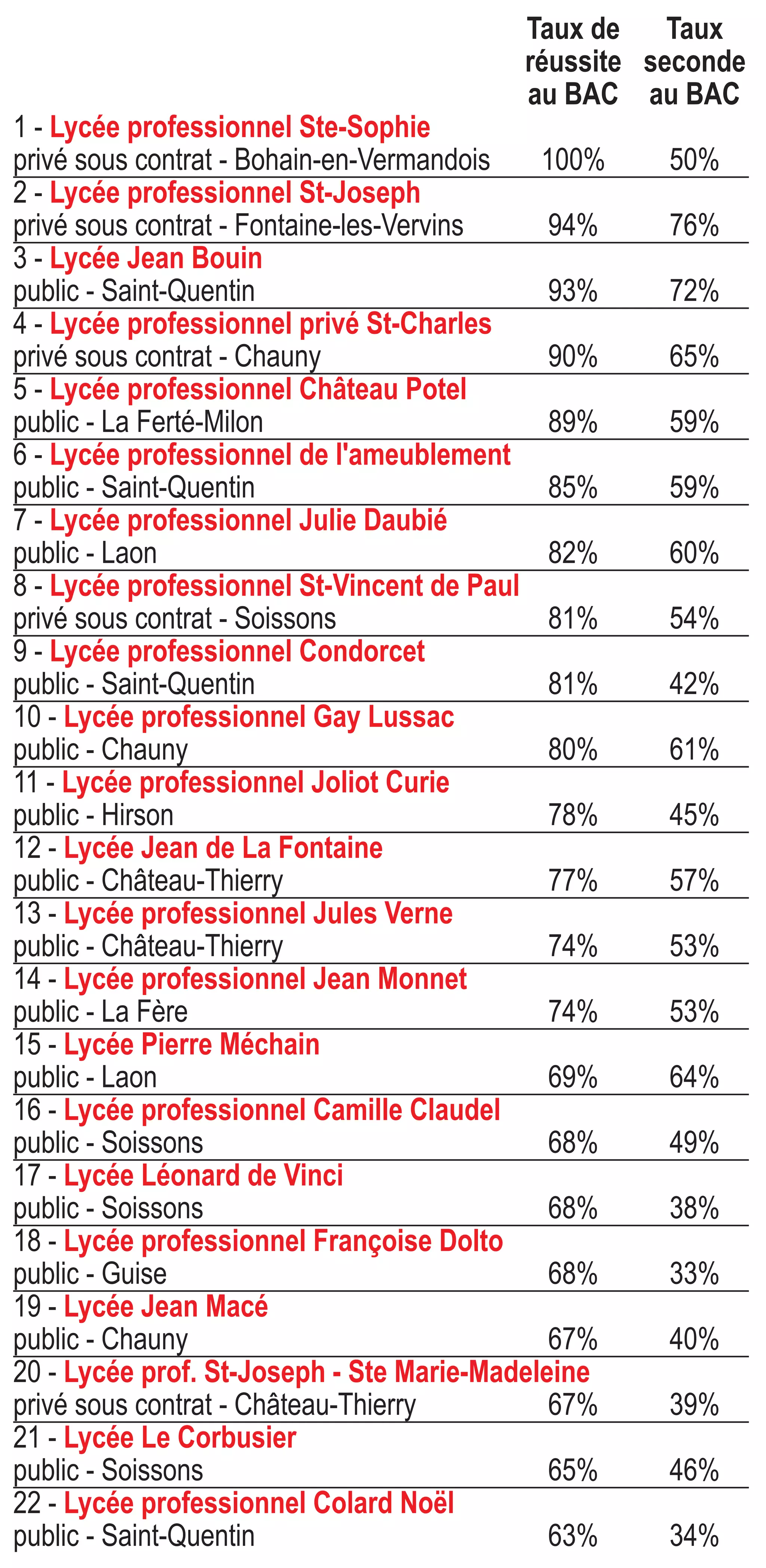 Le document présente les taux de réussite au bac pour divers lycées, classés par performance. Le lycée professionnel Ste-Sophie se distingue avec un taux de 100%, tandis que plusieurs autres établissements affichent des résultats entre 94% et 63%. Les données permettent de comparer l'efficacité des lycées professionnels privés et publics dans la région.