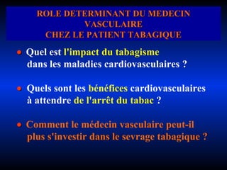Le document examine l'impact du tabagisme sur les maladies cardiovasculaires, soulignant que le tabac est un facteur de risque majeur, responsable de nombreuses complications et d'une mortalité accrue, notamment chez les jeunes. Il met en avant les bénéfices du sevrage tabagique, réduisant significativement les risques de maladies coronariennes et améliorant la survie des patients. Enfin, le rôle central du médecin vasculaire dans le soutien à l'arrêt du tabac est souligné, avec des recommandations sur les interventions et traitements efficaces.