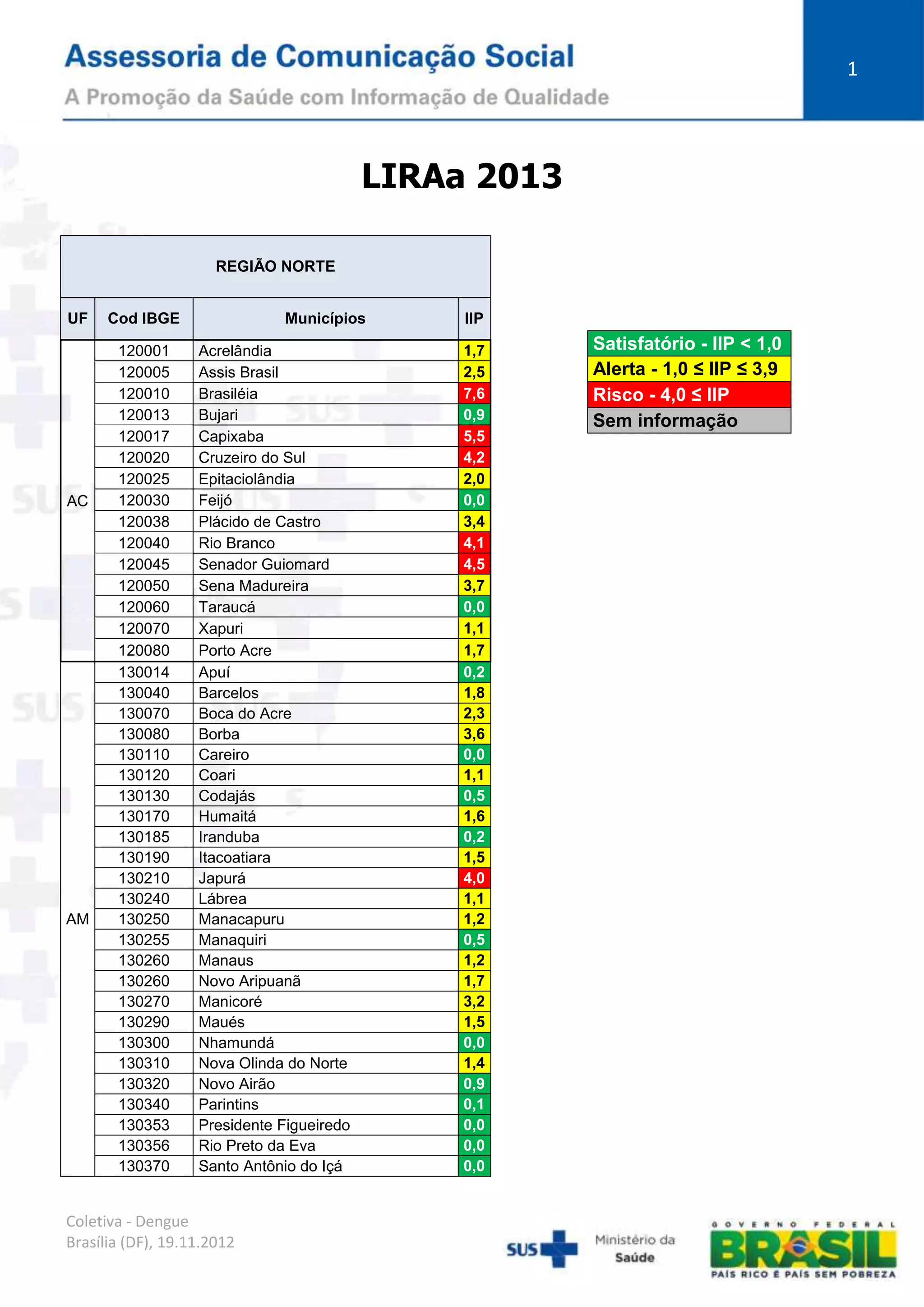 Le document fournit des données détaillées sur les indices d'incidence de la dengue dans diverses régions du Brésil, y compris les municipalités et les numéros d'identification. Les chiffres présentés reflètent les niveaux de risque déterminés à partir d'un indice de prévalence, avec des classifications telles que satisfaisant, alerte et risque. Ce rapport, daté du 19 novembre 2012, est destiné à informer sur la situation épidémiologique de la dengue dans le pays.