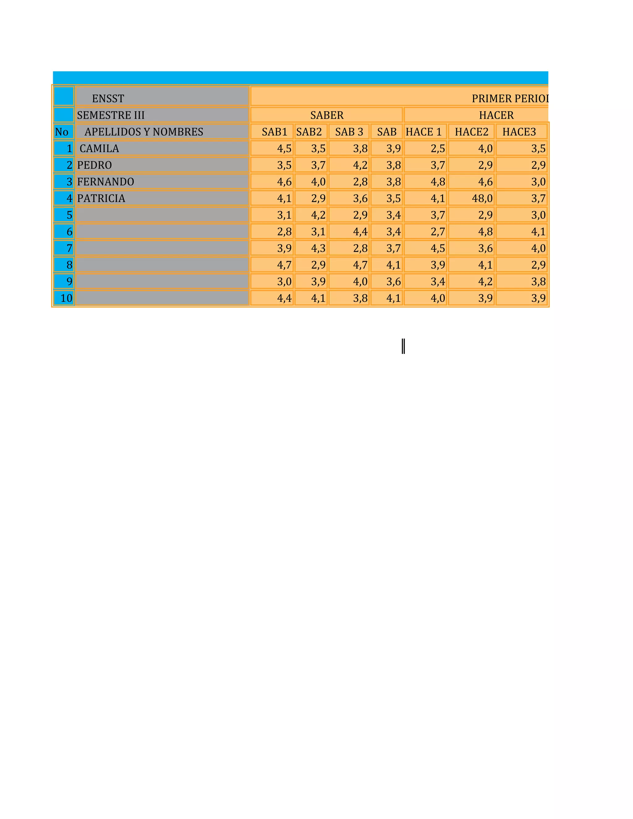 Le document présente des résultats d'évaluations scolaires pour plusieurs élèves, détaillant leurs notes dans différentes matières et périodes. Il récapitule les performances académiques sous forme de tableaux, illustrant les moyennes et les scores individuels. Les élèves mentionnés incluent Camila, Pedro, Fernando, et Patricia, avec des notes allant de 2,5 à 4,8.