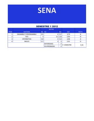 Le document présente les notes des étudiants pour le semestre 1 de 2012 dans différentes matières. Les notes sont réparties par matière avec des scores individuels et une note finale pour chaque matière. La performance globale est indiquée par une moyenne de 3,16 et un nombre d'échecs de 2.