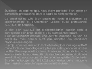 Le projet de partenariat professionnel en ergothérapie vise à concevoir une table de rempotage adaptée aux usagers d'une unité d'évaluation, de réentraînement et d'orientation sociale/professionnelle. Cette table permet aux adultes ayant subi un traumatisme crânien ou des lésions cérébrales de pratiquer le jardinage en tenant compte de leur condition physique. Le design inclut des caractéristiques telles que la réglabilité en hauteur, des sièges assis-debout et une facilité d'utilisation, répondant ainsi aux besoins spécifiques de divers usagers.