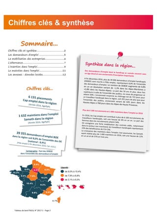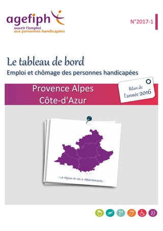 Le document présente des données sur l'emploi et le chômage des personnes handicapées dans la région Provence-Alpes-Côte d'Azur, mettant en lumière les caractéristiques des demandeurs d'emploi et les mobilisations des entreprises pour répondre à leurs obligations d'emploi. En 2016, 8,0% des demandeurs d'emploi étaient des bénéficiaires de l'obligation d'emploi, avec un accent sur l'importance de l'accompagnement et des mesures d'insertion professionnelle pour améliorer l'employabilité. Le rapport souligne également les évolutions des contrats d'alternance et des actions menées par des établissements pour favoriser l'emploi des personnes handicapées.
