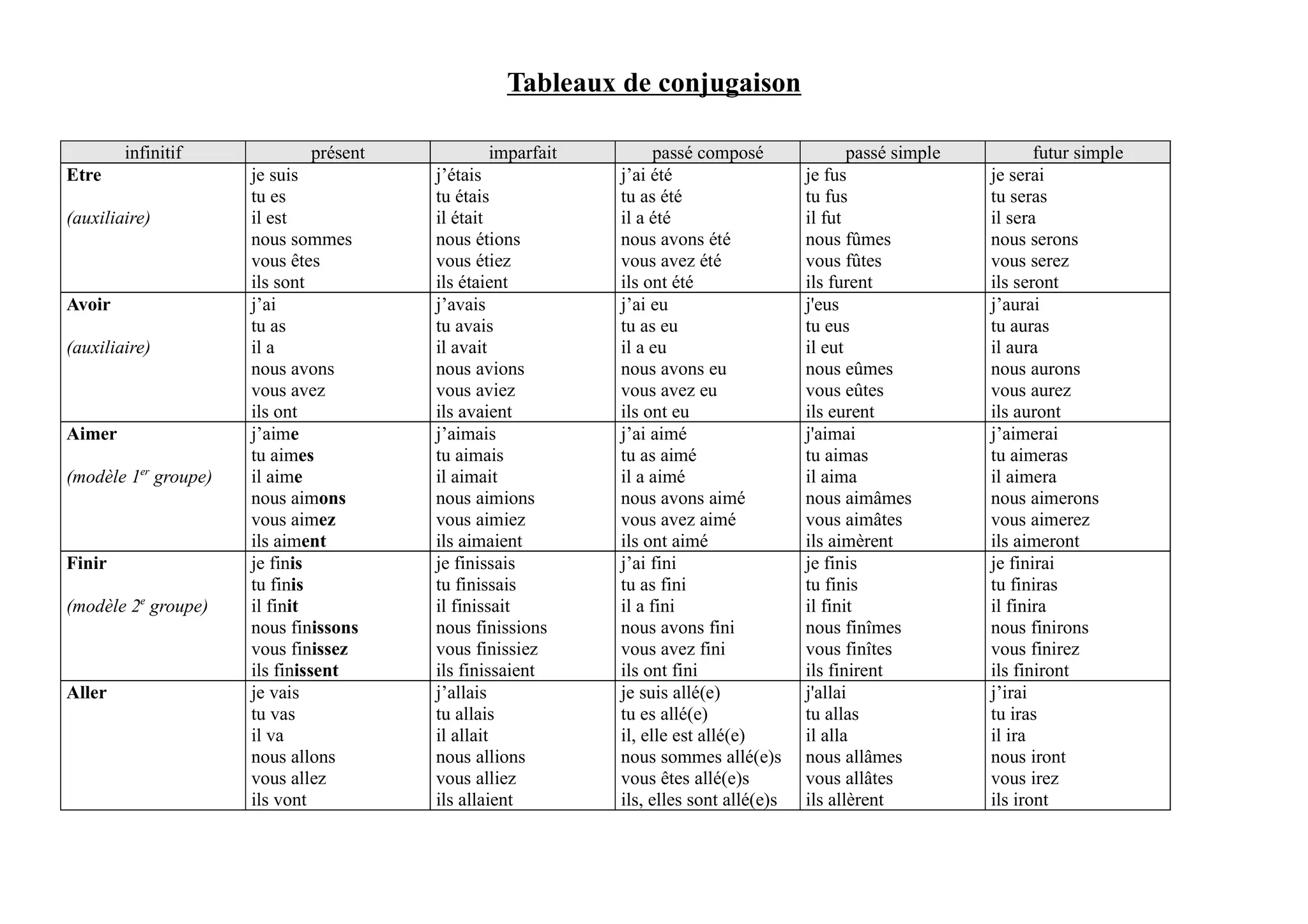 Le document présente une vaste conjugaison des verbes français, incluant les auxiliaires 'être' et 'avoir' ainsi que des verbes principaux comme 'aller', 'faire', 'dire', 'pouvoir', 'prendre', 'venir', 'voir' et 'vouloir'. Chaque verbe est décliné dans différents temps tels que le présent, l'imparfait, le passé composé, le passé simple et le futur simple, ainsi que dans des formes composées et conditionnelles. Il sert de référence pour la maîtrise de la conjugaison verbale en français.