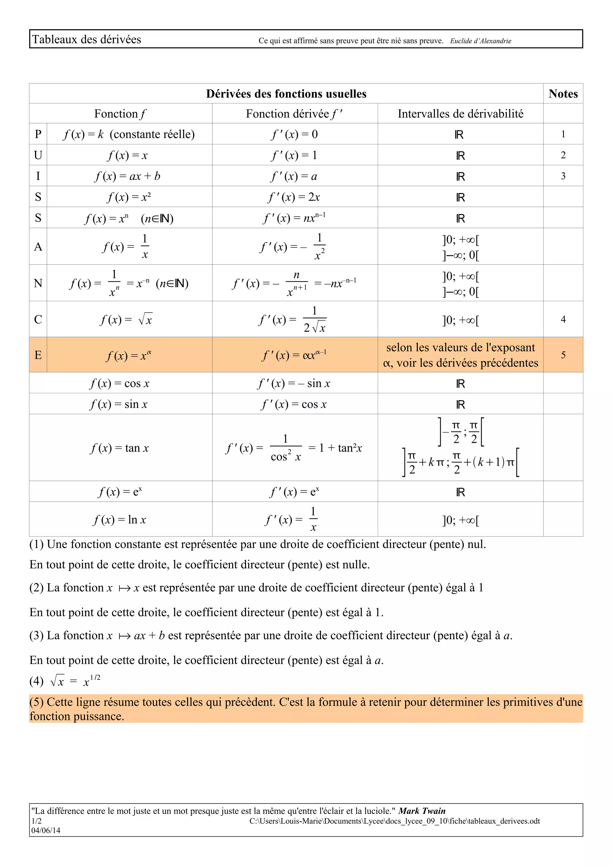 Le document présente un tableau des dérivées de fonctions courantes avec des formules et règles pour les dérivées d'opérations sur ces fonctions. Il détaille également la dérivée des fonctions composées et des cas particuliers en utilisant des exemples. En outre, il souligne que les affirmations sans preuves peuvent être invalidées sans preuve, en citant Euclide d'Alexandrie.