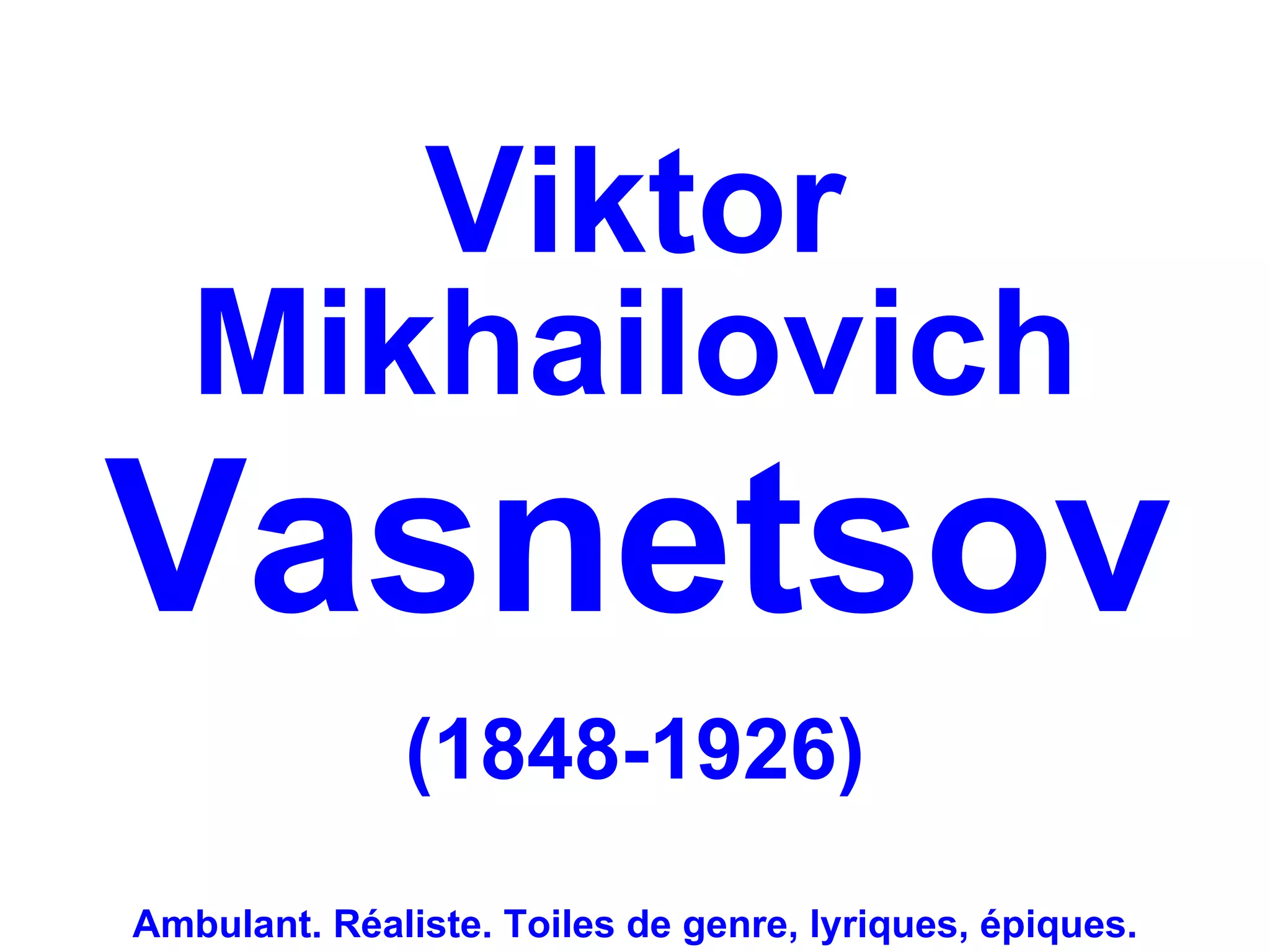 Viktor Mikhailovich Vasnetsov (1848-1926) est un peintre réaliste connu pour ses toiles de genre, lyriques et épiques. Ses œuvres emblématiques incluent 'Les Bogatyrs', 'Chevalier à la croisée des chemins' et 'Le tapis-magique', reflétant les contes et légendes russes. Le document explore également des thèmes comme la bataille, le folklore et l'imaginaire collectif de la Russie ancienne.