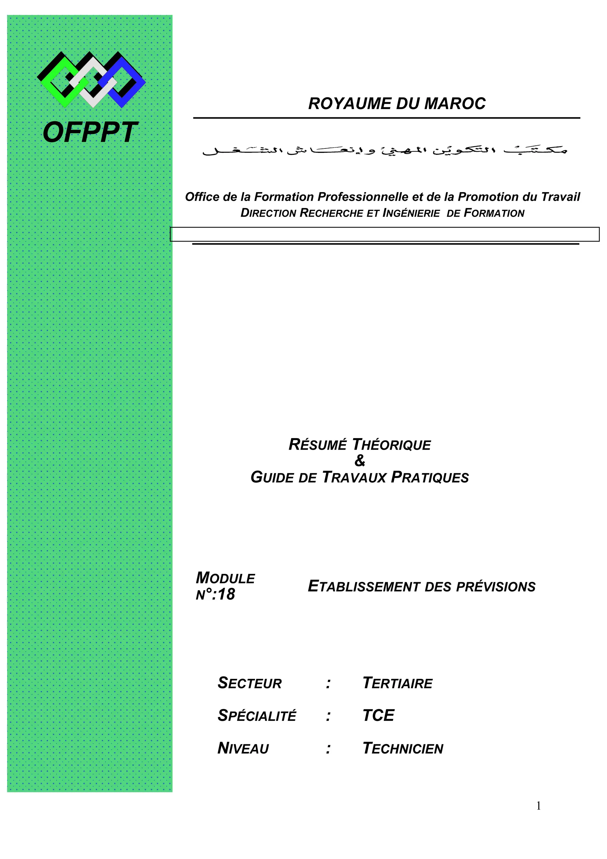 Le document présente un module de formation sur l'établissement des prévisions financières destiné aux techniciens dans le secteur tertiaire. Il couvre des thèmes tels que la méthodologie de gestion prévisionnelle, l'élaboration de budgets, et le suivi budgétaire, afin de préparer les stagiaires à gérer efficacement les budgets au sein de leur entreprise. En plus des concepts théoriques, le guide inclut des travaux pratiques et des études de cas pour renforcer l'apprentissage.