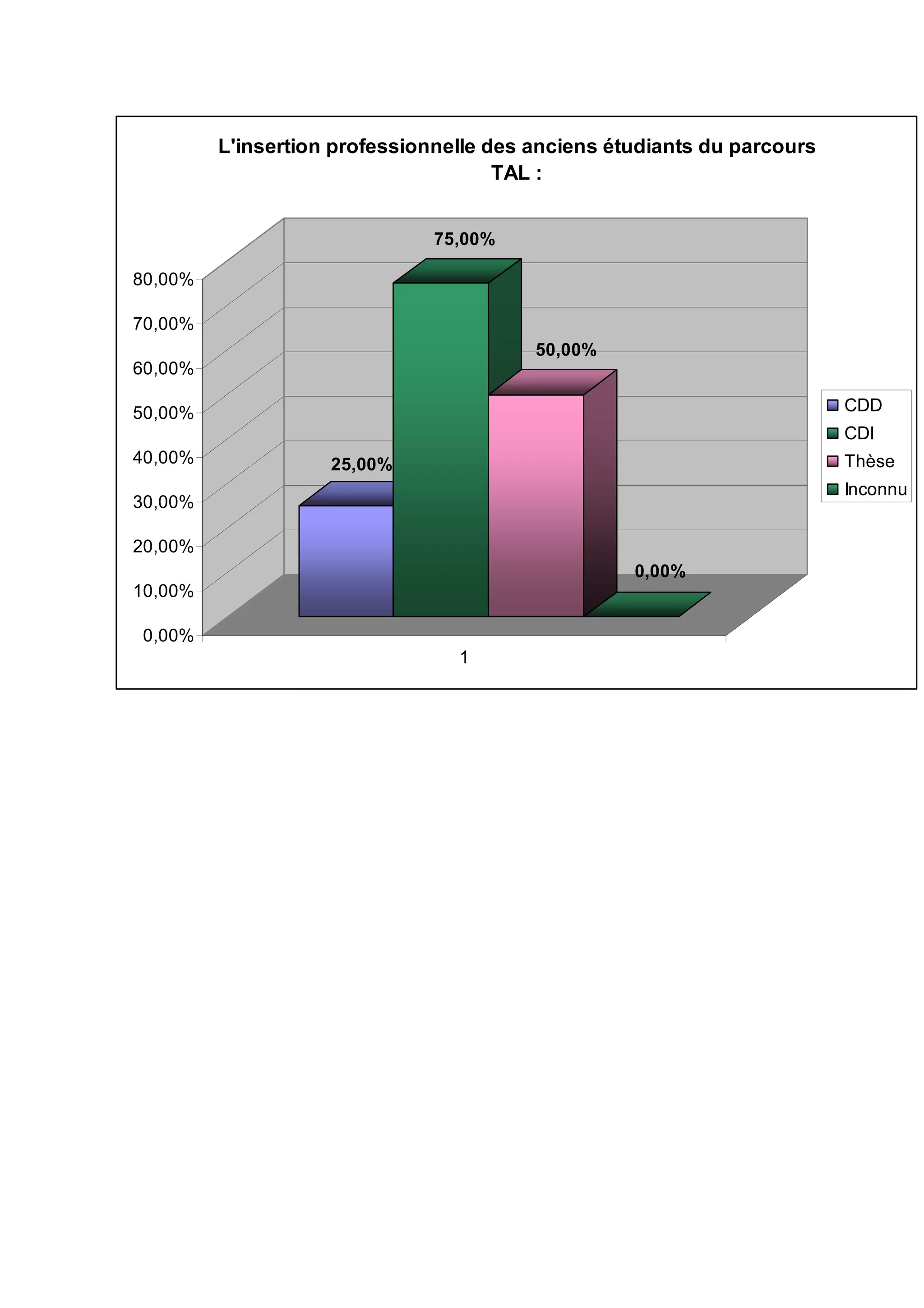 Le document présente les taux d'insertion professionnelle des anciens étudiants du parcours TAL, montrant qu'entre 50% et 80% sont en emploi, incluant des contrats à durée déterminée (CDD) et indéterminée (CDI). Une partie des diplômés est en thèse ou a un statut d'inconnu. Ces statistiques reflètent la diversité des parcours professionnels après l'obtention du diplôme.