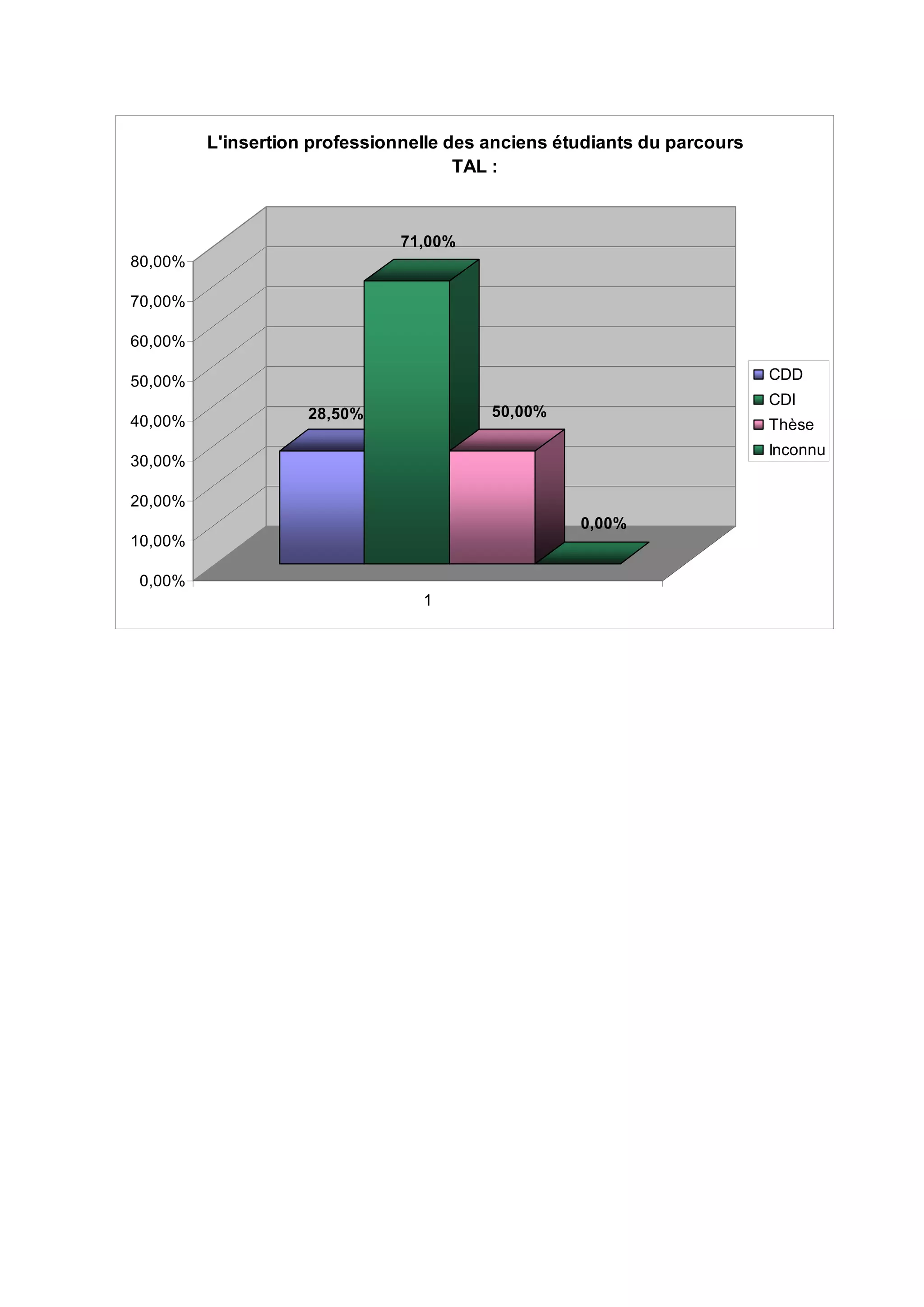 Le document présente des statistiques sur l'insertion professionnelle des anciens étudiants, avec un taux global de 71,00%. Il mentionne également la répartition entre les contrats à durée déterminée (CDD) et les contrats à durée indéterminée (CDI). Les données font état de variations notables dans les types de contrats, mais certains résultats restent inconnus.
