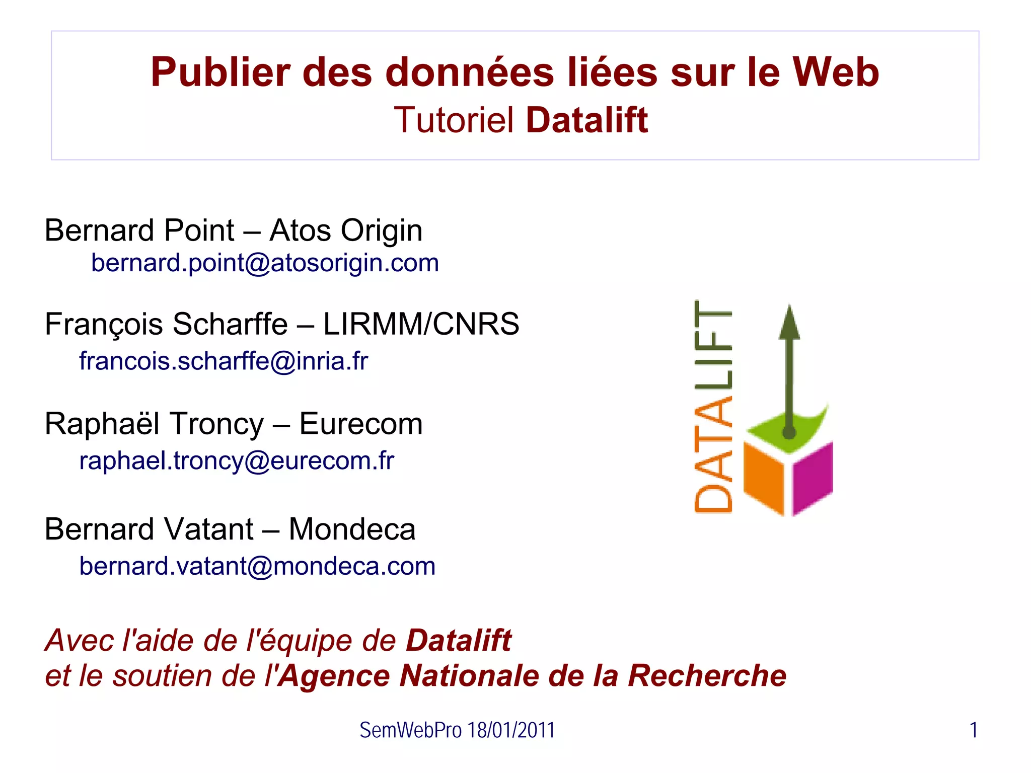 Le document présente un tutoriel détaillé sur la publication de données liées sur le web, accompagné d'exemples de vocabulaires et de meilleures pratiques. Il définit des étapes clés telles que la sélection des vocabulaires, la conversion et la publication, tout en mettant l'accent sur l'importance de l'interconnexion et des pratiques communautaires. L'initiative Datalift, soutenue par des partenaires associés, vise à automatiser et améliorer ce processus de publication de données sémantiques.
