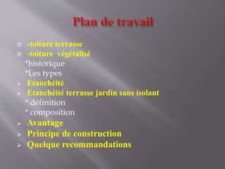 Le document traite des toitures végétales, y compris leurs types, leur historique, et les principes de construction. Il présente les avantages des toitures végétalisées, telles que l'amélioration de l'isolation, et décrit les différentes couches nécessaires pour leur mise en œuvre. Des recommandations sont également fournies pour garantir l'efficacité et la durabilité de ces systèmes.
