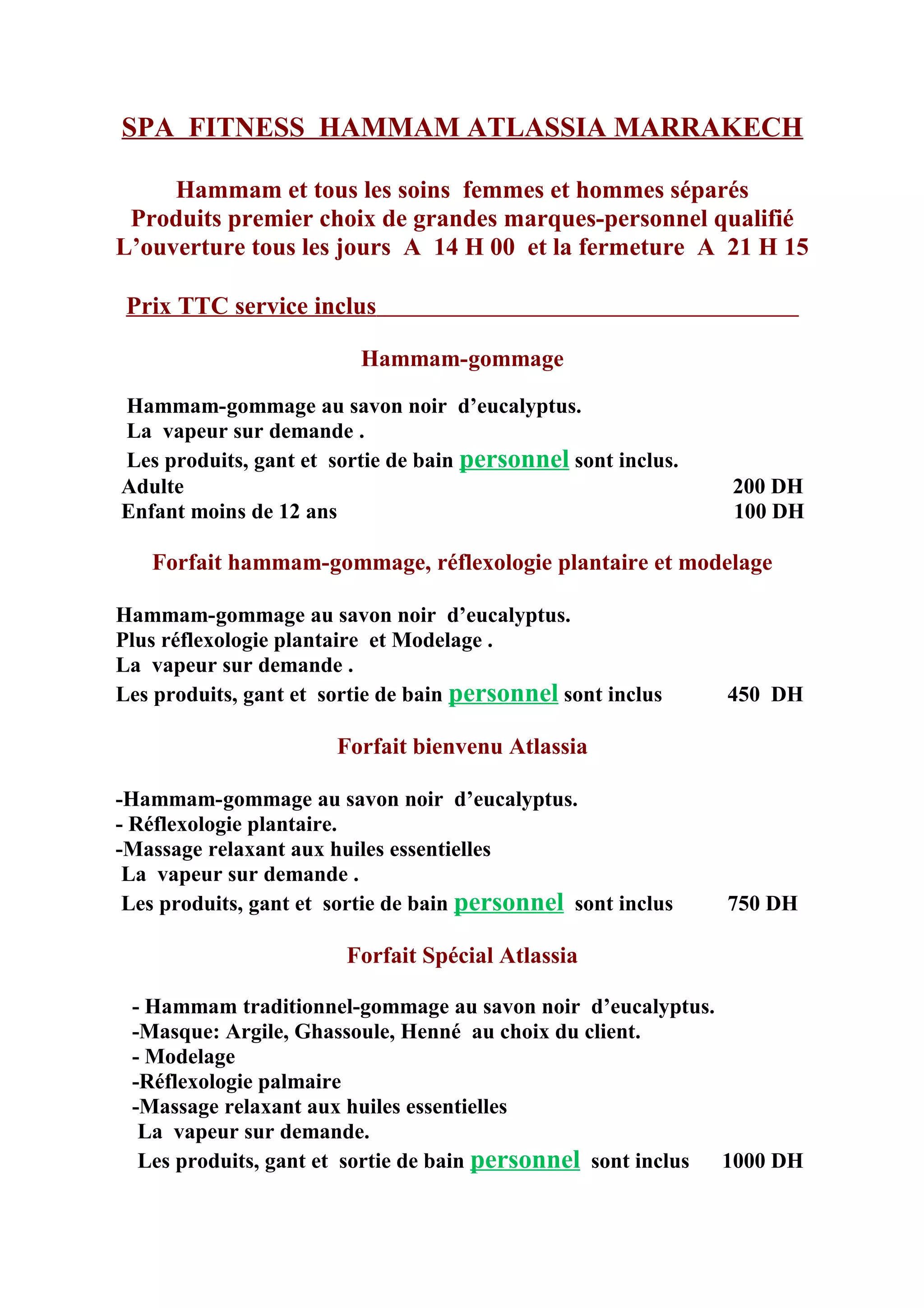 Le spa Atlassia à Marrakech propose une variété de services pour hommes et femmes, tels que le hammam, les massages et les soins esthétiques, avec des forfaits incluant des gommages et des traitements relaxants. Les tarifs varient selon les services, avec des options de sauna, d'épilation, de manucure/pédicure, et de soins capillaires disponibles. L'établissement est ouvert tous les jours de 14h00 à 21h15, et le personnel est qualifié pour offrir des soins de qualité.