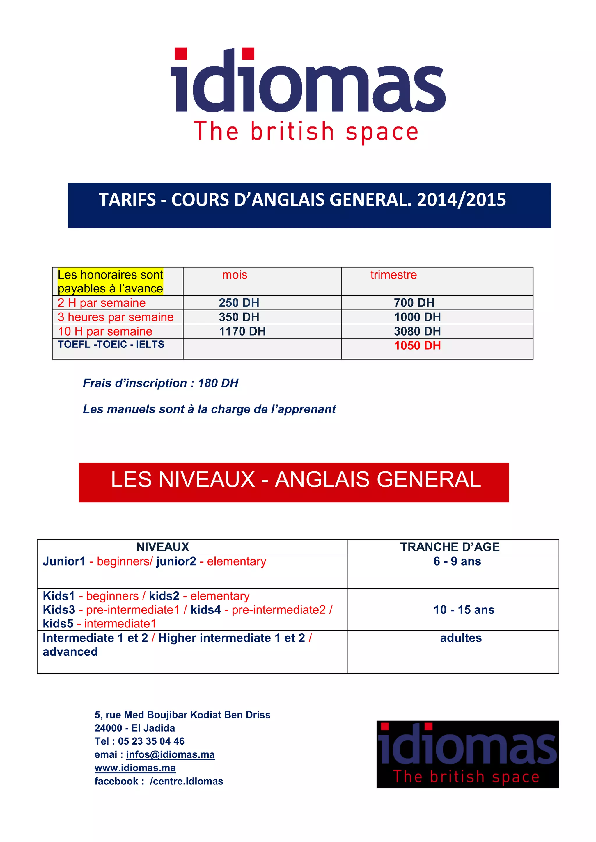 Le document détaille les tarifs et les niveaux de cours d'anglais et de français proposés pour l'année 2014/2015, incluant des informations sur les tranches d'âge, les volumes horaires et les frais d'inscription. Les cours sont organisés par tranche d'âge et des frais supplémentaires s'appliquent pour les manuels. Les tests de placement sont gratuits et les frais doivent être réglés avant le début des cours.