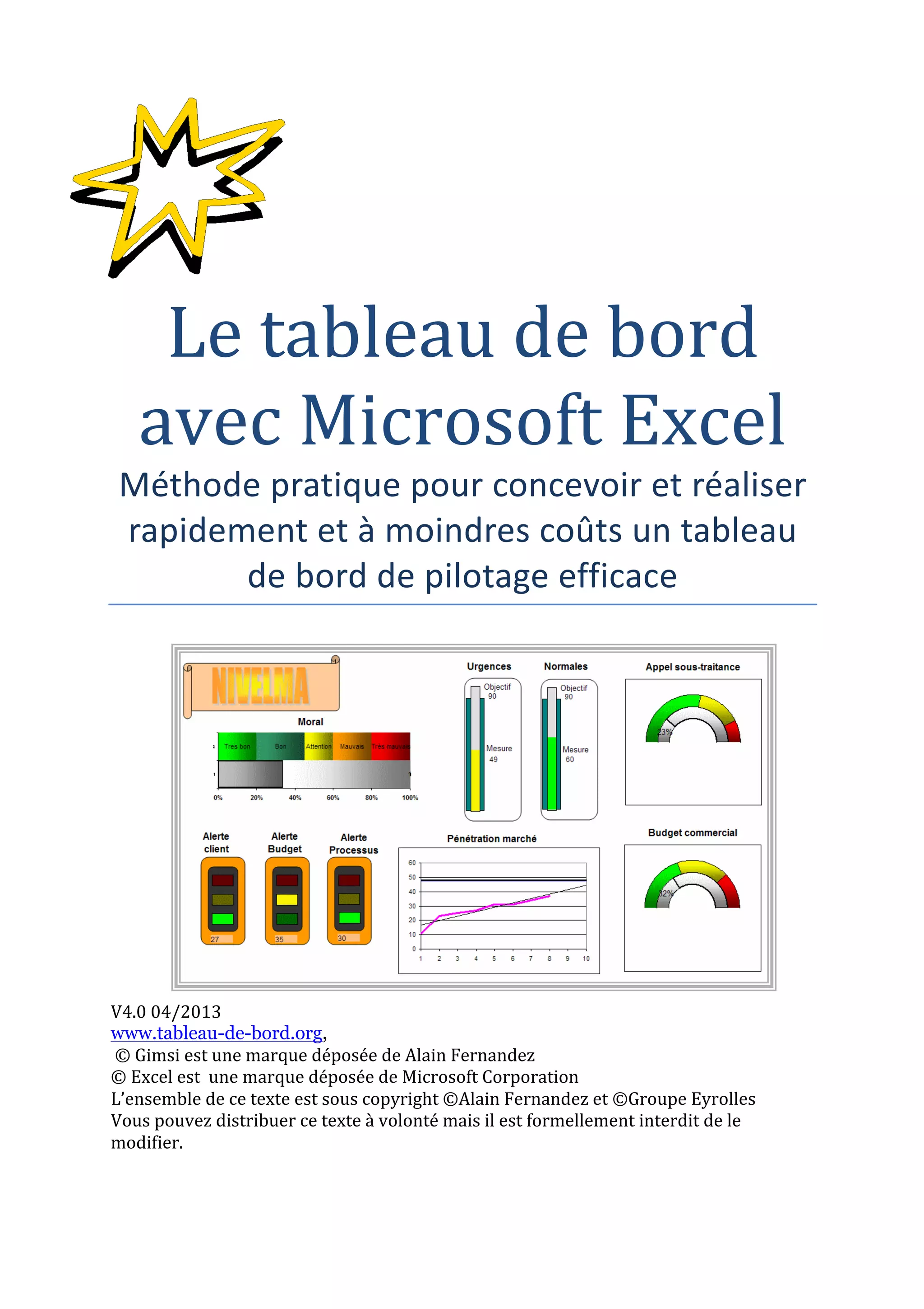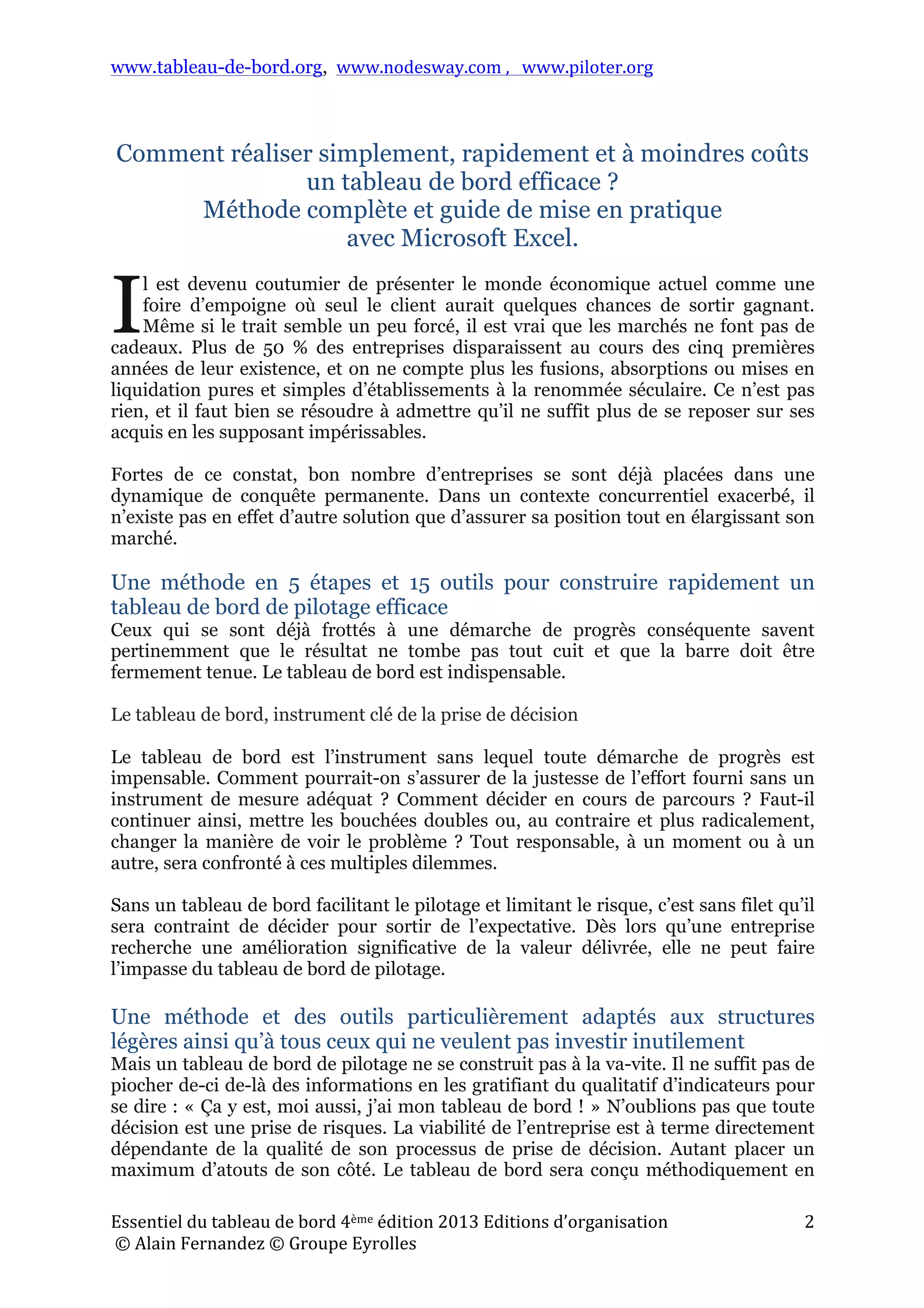 Le document présente une méthode pratique en cinq étapes et 15 outils pour concevoir un tableau de bord efficace à l'aide de Microsoft Excel, adaptée aux structures légères et aux environnements concurrentiels. Il insiste sur l'importance du tableau de bord dans le processus décisionnel et la nécessité d'une approche méthodique pour améliorer la performance des entreprises. Cette méthode vise à permettre une mise en œuvre rapide et à moindre coût, en rendant accessible à tous la création d'outils de pilotage pertinents.